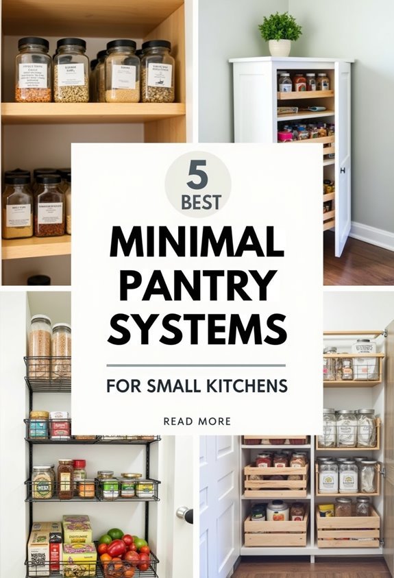 When it comes to maximizing your kitchen space with a minimalist pantry system, think about using natural materials like wood, metal, and glass. Light woods, such as bamboo or pine, can add warmth and texture, while sleek metal shelves provide a modern touch. Clear glass jars are perfect for storing ingredients, as they not only keep things fresh but also allow you to see what you have at a glance.